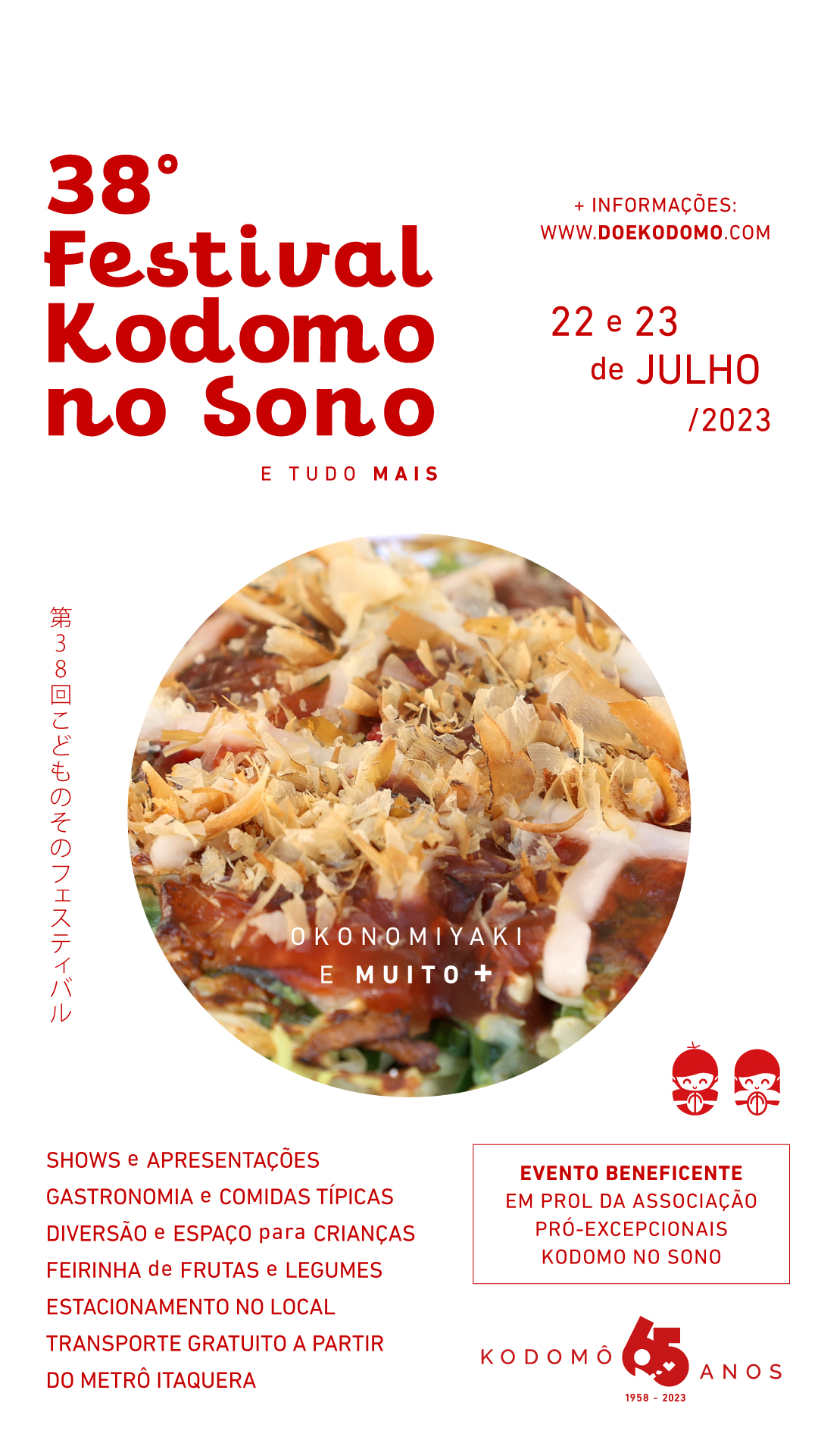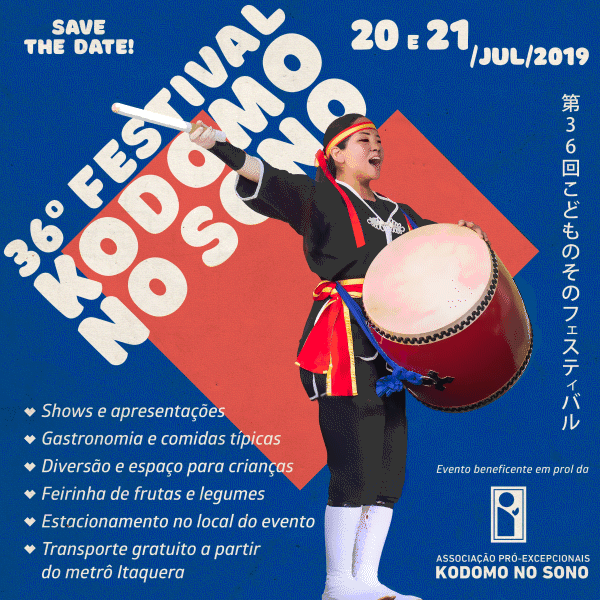 O Festival Kodomo no Sono é um evento beneficente recheado de atrativos gastronômicos e artísticos da cultura japonesa realizado em uma grande área de lazer ao ar-livre. Uma opção de lazer para curtir com a família, amigos e ainda contribuir de forma solidária.